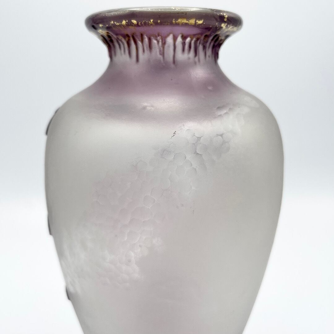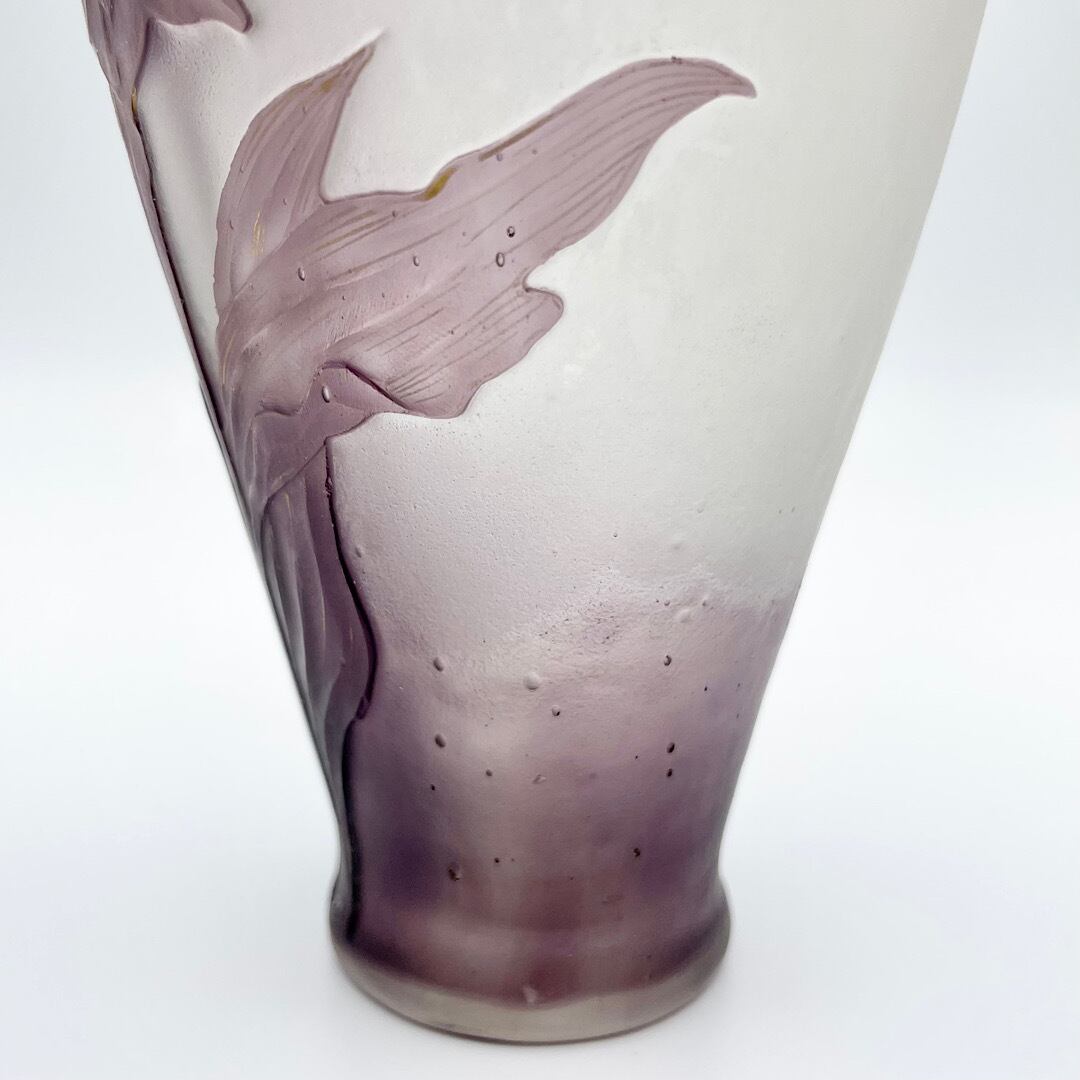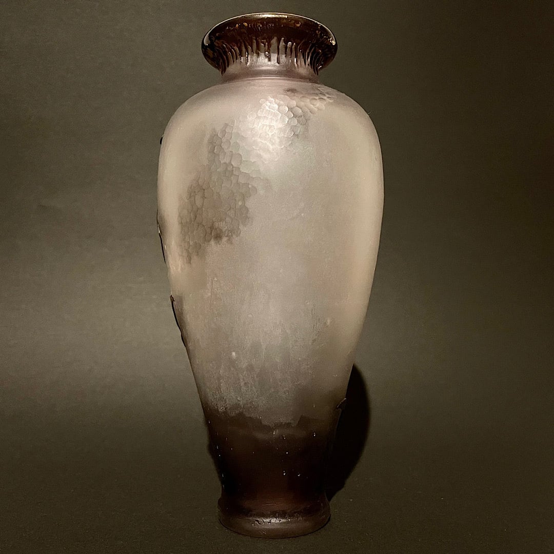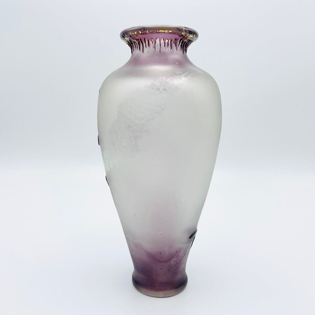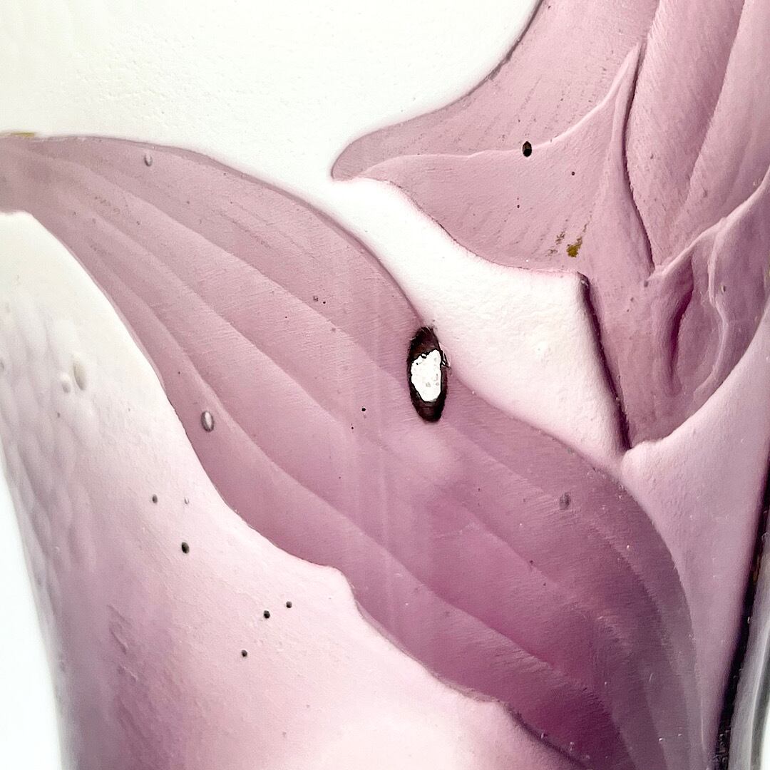当作品ですが、表面は被せガラスにエッチングを使用し立体的に花を描いています。それに加えて、槌目を思わせる【マルトレ技法】を部分的に使用。